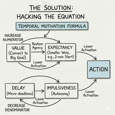When my son protests he isn’t trying to be difficult. He is just experiencing a low in his motivation equation, maybe the task feels imposed, too difficult, or low value. As an adult, I have to parent myself with the same empathy. Instead of beating myself up for “being lazy”, which only increases stress and procrastination, I need to move the levers that I know work and have worked for me in the past:
