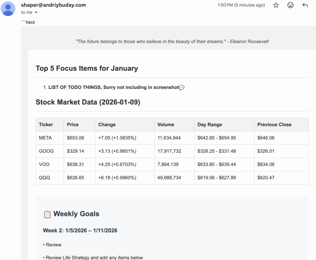 So what I’ve built in 3 hours is a “personal AI agent that automatically generates daily digest emails by fetching data from multiple sources in parallel: it retrieves stock market insights for ~X tickers, extracts the current week’s goals (with checkbox tracking) from a tabbed Google Doc, pulls my monthly focus items, pulls net worth data from a Google Sheets dashboard, then uses Gemini to generate a professionally formatted HTML email summary and sends it via SendGrid. The system is built with LangGraph for workflow orchestration, uses OAuth2 for secure Google API access, and preserves formatting details like checkboxes (✅/⬜) by converting them to email-compatible emoji before direct insertion into the final email.”