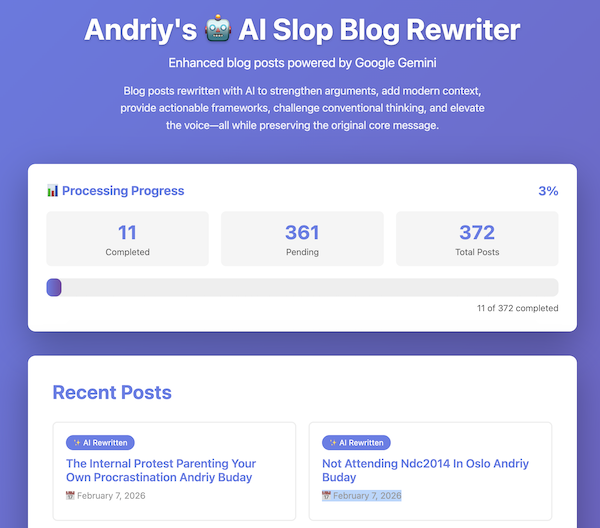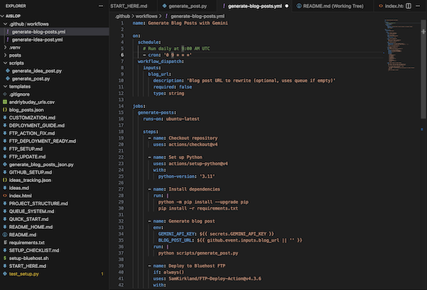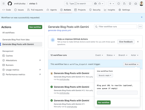 I was recently challenged on why my weekly blog posts are not written by AI. I do have my strong opinions on this and arguments against it but before I delve into them I wanted to accept the challenge. So in about 3 hours of vibe coding I built an automated GitHub and Google Gemini powered workflow that picks either an idea from ideas.md file or one of my older blog posts on this website and (re-)writes a new blog post based on that and then uploads it to my dedicated aislop subdomain.