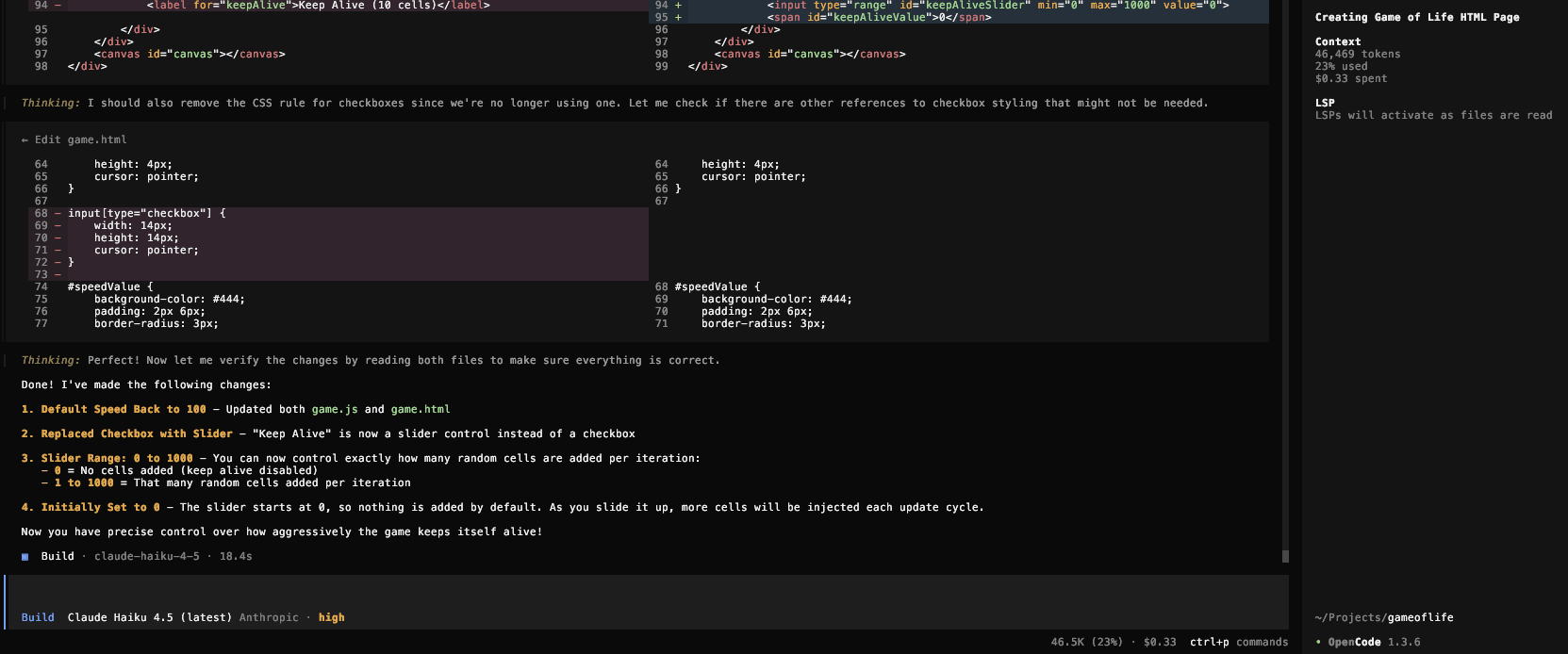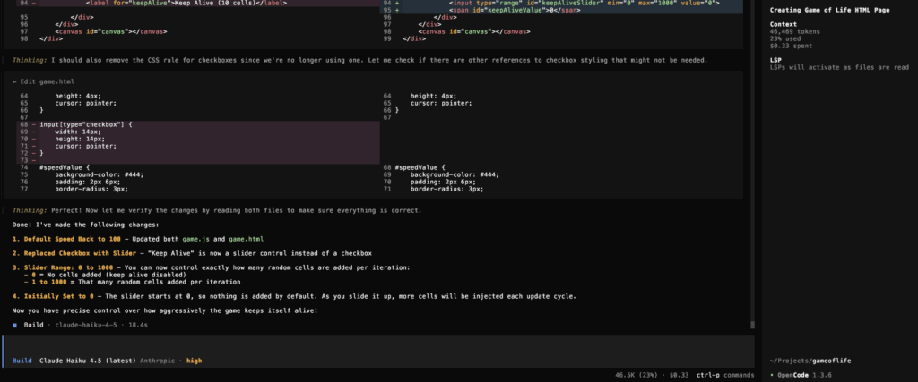 I then switched to Claude Haiku 4.5 to generate the Game of Life you can see above.