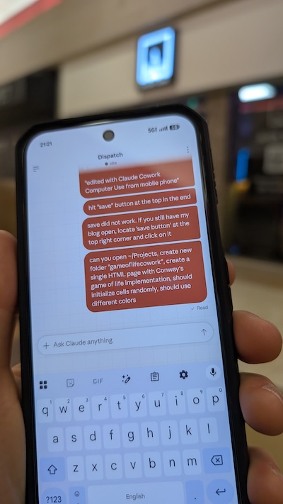 As you can see I’m somewhere in a mall, asking my Claude Cowork running on my mac at home to create a folder ~/Projects/gameoflifecowork and generate a single HTML page with Conway’s game of life implementation. I came home and there it was an html page right in that folder with the implementation. It is perfectly working. I’m adding it here. If you are reading from e-mail you would need to open the blog to see it in action.