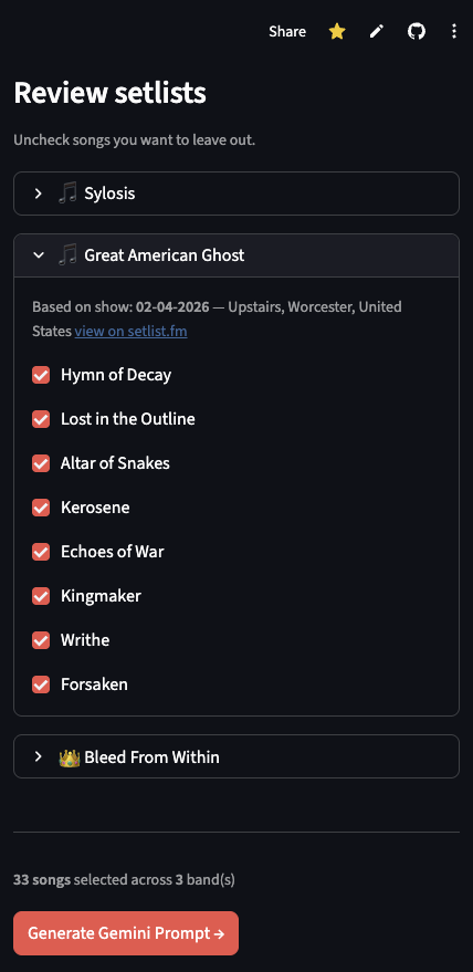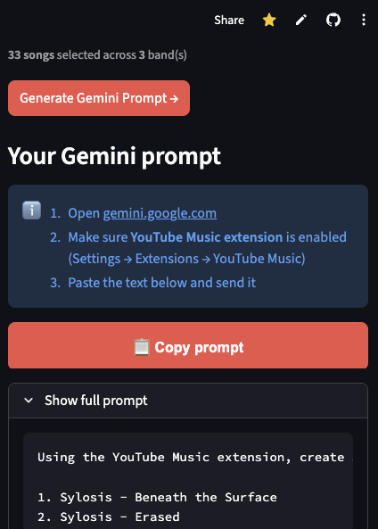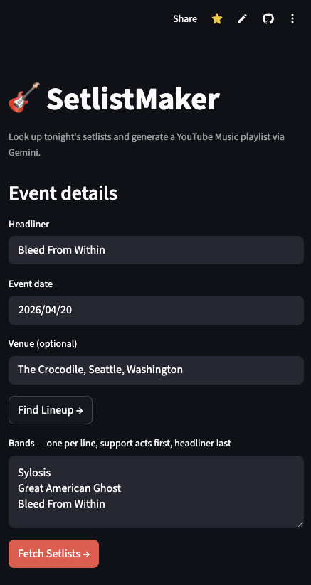 Written by AI: The whole thing runs on two Python files, two API keys, and zero JavaScript. Streamlit handles the UI — I didn’t write a single line of HTML. setlist.fm has a free API that returns recent setlists for any band. Ticketmaster has a real public developer API (unlike BandsInTown, which I wasted time on — their keys are per-artist only, nuts) that gives you the event lineup. And Gemini with its YouTube Music extension does the actual playlist creation — no YouTube API, no OAuth dance, just a well-formatted prompt. The whole backend is one API call to Ticketmaster, one to setlist.fm per band, and a string formatter. That’s it.
