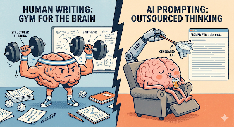 You mention LLMs generate “flowery” text that sucks. While often true, advanced prompting can mimic style fairly well. Suggestion: Strengthen the argument that the value isn’t the final text, but the struggle to produce it. Even if an LLM wrote a perfect post in your style, it would still be a “waste” because you didn’t do the cognitive lifting to get there. It’s like sending a robot to the gym for you.