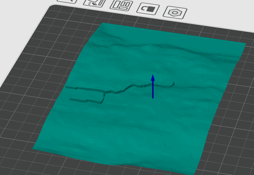 Now that I had different objects prepared, I went to add them to Orca Slicer. The most challenging part with terrain was that it wasn’t printing because it was just a surface floating in the air instead of filled-in mesh, so the technique that worked for me was to assemble Cube and meshed terrain from Blender and then do Mesh binary difference between the two, leaving the bottom part of the Cube that was sliced by the terrain. This is what I got in the model: