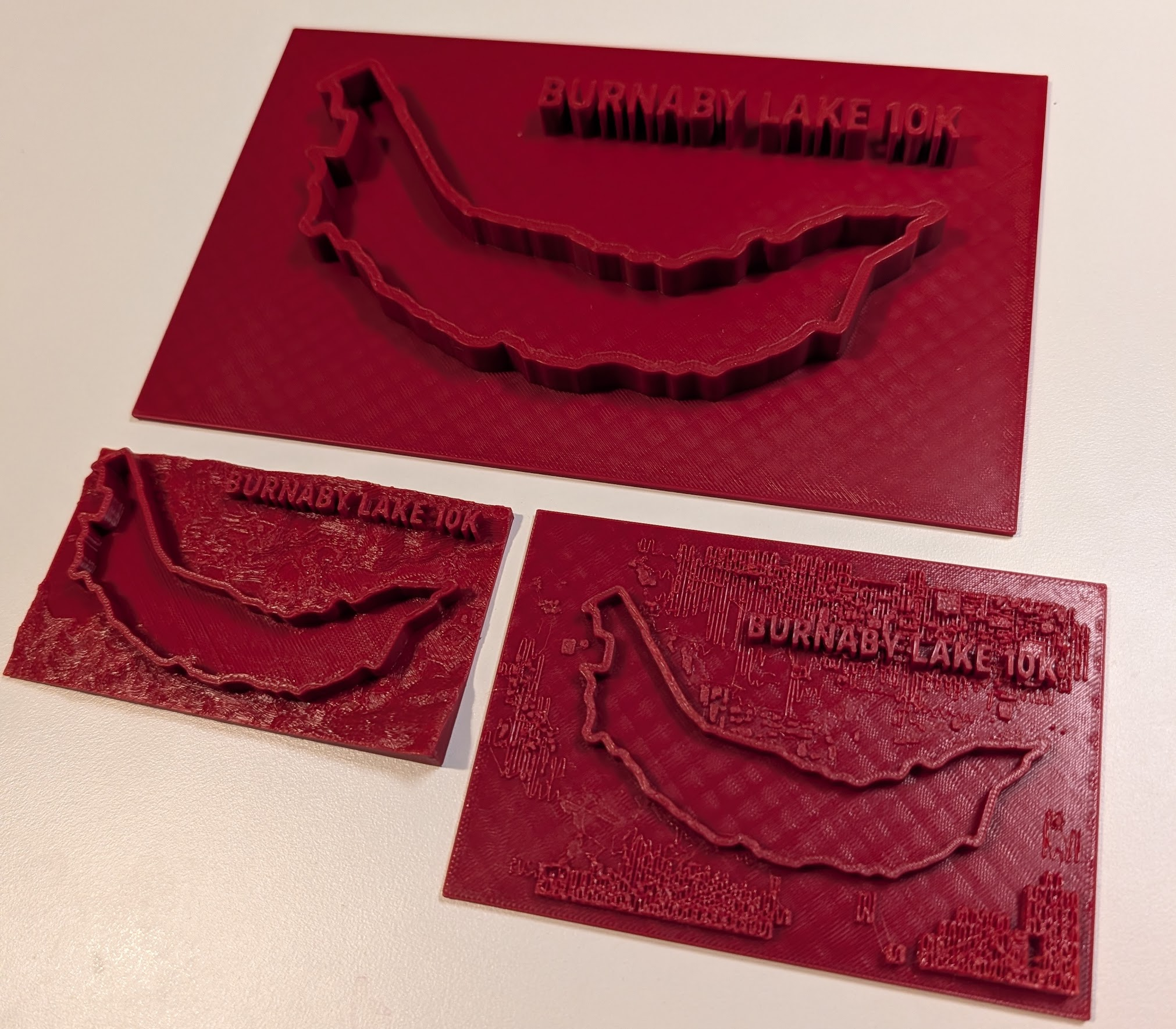Turns out that printing tiny buildings actually doesn’t work too well so I stopped on just using the terrain and the trail. Here are 3 results: